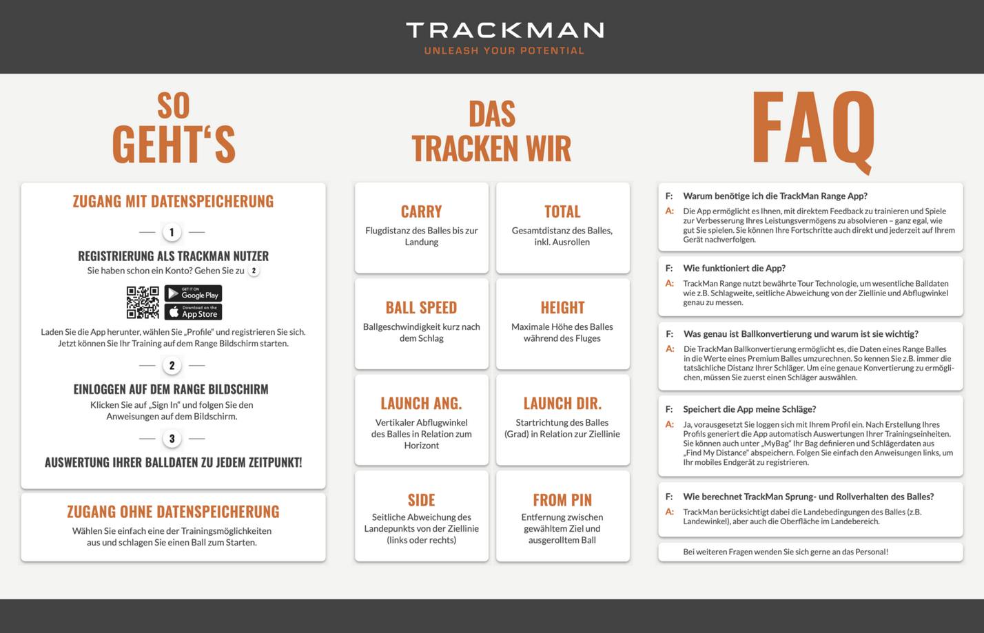Dazu müsst ihr Euch einfach die Trackman Range App herunterladen und ein Benutzerkonto erstellen. Danach könnt ihr jederzeit auf Eure persönlichen Leistungsdaten und Spieloptionen zugreifen.